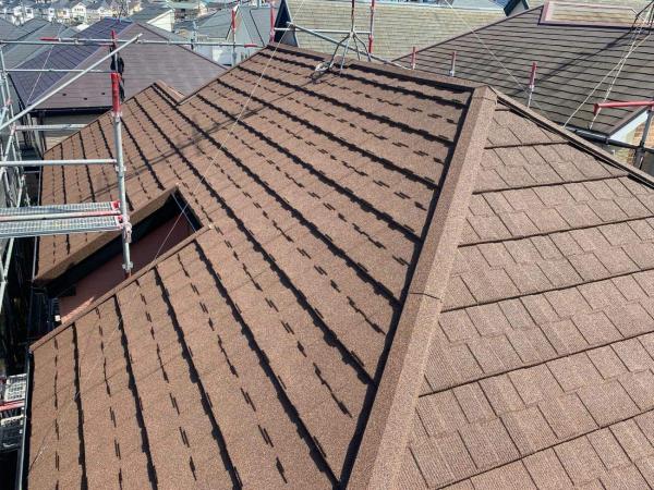 | 仕様 | 屋根材:セネター(ティーク) 防水ルーフィング:ルーフラミテクト 棟板金/役物:セネター専用部材 シーリング:オートンイクシード |